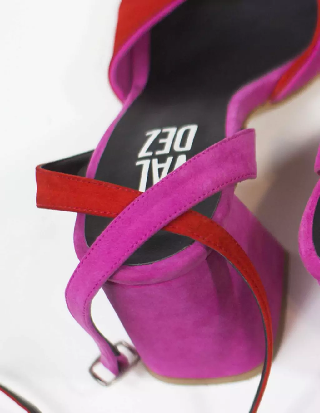 Confeccionada en gamuza bitono con capellada revertida, su diseño único se destaca por la pulsera bitono que continúa el efecto, y el taco columna de 9 cm forrado en gamuza combinada.